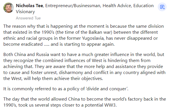之所以现在发生这种情况,是因为 1990 年代(巴尔干战争时期)存在于前南斯拉夫不同民族和种族群体之间的同样的分裂因素从未消失或被根除......它又开始出现了。中国和俄罗斯都希望在世界上拥有更大的影响力,但他们认识到西方的综合影响正在阻碍他们实现这一目标。他们意识到,他们为在任何与西方结盟的国家引发和助长动乱、不和谐和冲突而提供的帮助和援助越多,将越有助于他们实现目标。回到 1990 年代,在世界允许中国成为世界工厂的那一天,我们离潜在的第三次世界大战更近了几步。几个世纪以来,塞尔维亚和俄罗斯一直是非常要好的朋友。如果你比较一下前南斯拉夫和乌克兰的战争,你会发现它们非常相似。塞尔维亚人也犯下了巨大的暴行,比如在克罗地亚的Vukovar(就像乌克兰人在马里乌波尔的所作所为),然后是Srebrenica。在战争期间,塞尔维亚向克罗地亚首都Zagreb投掷了炸弹(被禁止的集束炸弹),目标就是平民,他们还在Zagreb市中心使用火箭弹袭击克罗地亚的总统和政府!但要明确指出的是,没有人袭击塞尔维亚!前南斯拉夫分裂时,塞尔维亚袭击了这些前加盟共和国、斯洛文尼亚、克罗地亚、波斯尼亚和Hercegovina。塞尔维亚轰炸克罗地亚时,克罗地亚没有向塞尔维亚发射子弹!没有!尽管塞尔维亚犯下了所有的破坏和暴行。现在克罗地亚已经独立,它是北约的一部分,但波斯尼亚和Hercegovina与乌克兰东部一样,那里的居民都是塞族人,这是导致三个族群生活非常贫困的原因。无疑,就像俄罗斯一样,塞尔维亚也在利用它们将塞尔维亚的影响延伸到波黑。塞尔维亚在前南斯拉夫和科索沃也做了类似的事情——有趣的是,塞尔维亚还使用“特殊军事行动”对阿尔巴尼亚人进行了种族清洗。