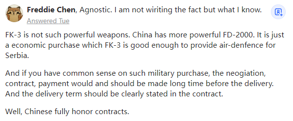 不可知论者,我不是在写事实,我只是在写我知道的,2013年至今生活在西澳大利亚州珀斯FK-3并不是什么强大的武器,中国拥有更强大的FD-2000。这只是一笔合算的采购,FK-3足以为塞尔维亚提供空中防御。如果你对这类军事采购有常识,那么你应该知道在交货前很长一段时间内你就会并且应该支付款项,合同中应明确规定交货期限。studied at Munich University of Applied Sciences,Lives in Australia