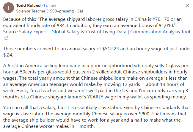Science Teacher (1990–present)因为:“中国造船工人的平均总工资为 70,170 元人民币(¥70,170),相当于每小时 34 元人民币(¥34)。此外,他们的平均奖金为1010元(¥1,010)”。这些数字换算成年薪为512.24美元($512.24),时薪略低于0.24美元($.24)。在美国,一个6岁的孩子在一个贫穷的社区里卖柠檬水,即便每小时只卖1杯,每杯只卖50美分,就能比2名熟练的中国成年造船工人赚得更多。中国造船工人平均每年的总收入低于美国青少年平均割草12码(约13小时)的收入。见鬼,我是一名教师,虽然我们在美国的工资不高,但我的钱包里现在揣着一名中国造船工人3个月的工资。你可以称之为工资,但它本质上是奴隶|劳动。即使按照中国的标准,这个工资也是奴隶|劳动,因为中国人的平均月薪超过800美元,这意味着普通的造船工人需要工作一年半才能达到中国工人平均一个月的收入。