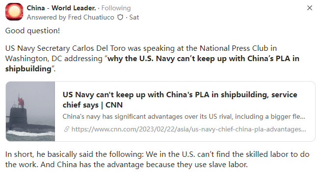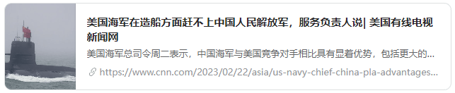 妒忌中国海军下饺子,美国海军部长竟然说中国正在使用奴隶劳工建造军舰本文译自Quora,原标题:Why did the US Navy secretary say that China is using slave labor to build their warship?“美国跟不上中国了。”周二,美国海军高层对比了中美的军舰建设。期间,他一边渲染“中国威胁论”,一边污蔑中国造船厂使用所谓“奴隶劳工”,结果连美媒都不信他的话……据美国有线电视新闻网(CNN)2月22日报道,周二,美国海军部长卡洛斯·德尔·托罗(Carlos Del Toro)在华盛顿的“国家记者俱乐部”发表讲话,试图炒作“中国寻求跨洋投射其影响力”。他称,中国海军拥有更大的舰队和更强的造船能力,与美国竞争对手相比具有显著优势。“美国海军部长称,美国跟不上中国的军舰建设” 报道截图他先是铺垫说中国“现在拥有更大的舰队,而且正在全球部署这支舰队”,然后讲出了他的最终目的:作为回应,华盛顿必须升级美国舰队。这位美国海军部长称,中国海军在未来几年可能会部署多达400艘舰艇,而目前约为340艘。与此同时,美国舰队的舰船数量不足300艘。根据美国海军去年夏天发布的计划,五角大楼的目标是在2045年前拥有350艘有人战舰,这一数字仍然远远低于中国舰队的设想。美媒还提到,在实现这一目标之前,根据美国国会预算办公室去年11月的一份报告,随着老旧舰船退役,美国舰队规模预计将缩小。除了舰艇规模,德尔·托罗周二同时表示,美国海军造船厂的产量无法与中国造船厂相比:“他们有13个造船厂,而且在某些情况下,他们造船厂的产能更大——一个造船厂比我们所有造船厂加起来的产能还要大。这是一个真正的‘威胁’。”有意思的是,德尔·托罗在描述中美产能差距的同时,又照搬了美国政府此前的炒作套路,污蔑中国造船厂使用所谓“奴隶劳工”,但没有提供细节来证明他的无理指控。美国企业研究院的印太防务政策专家布莱克·赫青格(Blake Herzinger)说:“中国拥有非常庞大的可用人力资源,在对国家安全至关重要的高科技领域使用‘奴隶劳工’真的讲不通。”赫青格还批评说,德尔·托罗这样的言论表明,美国的注意力放错地方,损害了美国的能力。因为在美国目前的政治氛围中,你不能承认中国的任何成就。当你出于任何原因(比如要求为你管理的武装部队提供更高的预算)而不得不这样做时,你需要以某种方式扭曲中国的这种成功,这样你就不会被无视。中国正在建造更多军舰?那他们肯定使用了奴隶|劳动。没有证据?别担心,CNN,NYT,Fox根本不在乎。