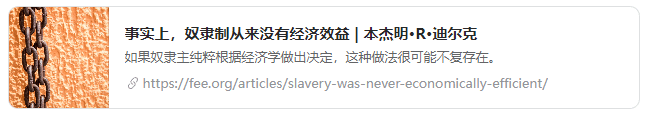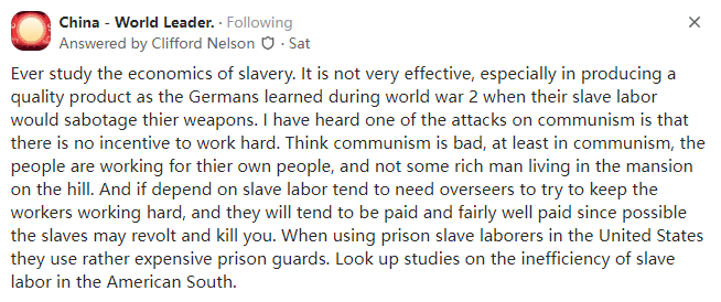 BS from University of Chicago我曾经研究过奴隶制经济学。它并不是很有效,尤其是在生产高质量的产品方面,正如德国人在第二次世界大战期间了解到的那样,他们的奴隶劳工会破坏他们的武器。我听说对GC主义的攻击之一就是它缺乏努力工作的动力,(虽然有人)认为GC主义坏,但至少在GC主义中,人民是在为自己的人民而不是住在山上的豪宅里的富人工作。如果依赖奴隶劳动,往往需要监督者来让工人努力工作,而且他们往往会得到非常丰厚的报酬,因为可能的话,奴隶可能会反抗并杀死你。在美国,当他们使用监狱奴隶劳工时,他们会配备成本相当昂贵的狱警。你可以查阅一下关于美国南方奴隶劳动效率低下的研究。美国领|导人对中国提出了这些关于奴隶劳工的指控,这让许多人觉得这确实表明美国人缺乏运用自己的思想和思考的能力,他们只是复述从别人那里听到的话而没有分析它是否合理。毕竟,并不是每个美国人都了解二战期间奴隶劳工对德国武器的破坏,GC主义之所以失败是因为缺乏激励措施,经营种植园需要为奴隶提供食物、住所和照顾,还需要配备监督员。美国内战后,种植园主使用佃农比使用奴隶要便宜得多。毕竟,佃农们不需要食物、住房和照顾,而农场主依然能分得一份他们的劳动成果。
