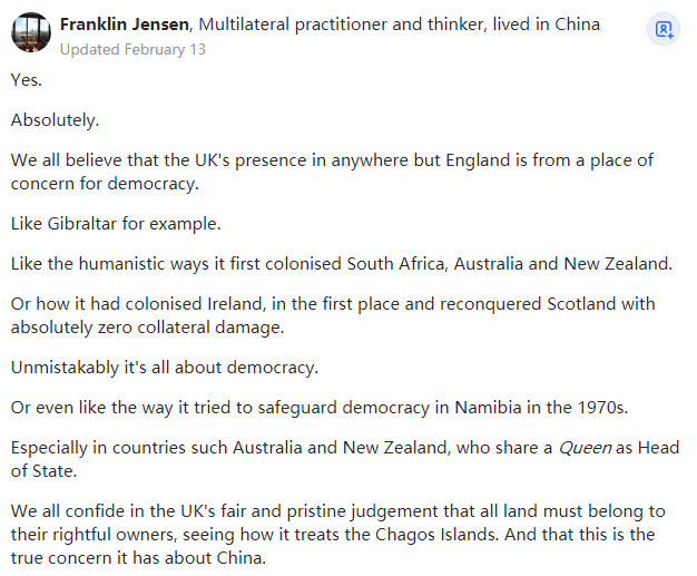 我们都相信,除了在英格兰之外,英国出现在任何地方都是出于对民|主的关心。或者它是如何殖民爱尔兰并以绝对零附带伤害的方式重新征服苏格兰的。甚至就像它在20世纪70年代试图维护纳米比亚的民|主一样。尤其是在澳大利亚和新西兰这样的国家,他们共享一位女王作为国家元首。我们都相信英国的公正和判定,即所有的土地必须属于其合法的所有人,看看它是如何对待查戈斯群岛的,这才是它真正关心的中国的问题。毫无疑问,如果英国重返一个非本土的大洋,那意味着不会有多少对抗。要知道,你在外国海域派遣的船只越多,你遇到敌方海军的可能性就越小。目前尚不清楚谁受到了中国威|权主义的冲击,但如果英国认为自己有受到中国威|权主义影响的风险,并且偏执地想象中国的威|权主义能够穿越海峡阻隔的两个大洲影响到它,那么它在身体和精神上肯定都非常虚弱。但有趣的是,提问者是否真的相信英国的小船现在有能力捍卫民|主?这种把民|主、政体和对外军力投射等同起来的人,一定有一颗纯洁的心。愿上帝保佑你的纯真,因为今天的人类拥有无可否认的高尚原则和天真的灵魂真的是非常难得的。译注:查戈斯群岛,Chagos Archipelago,查戈斯群岛是片位于印度洋中心的群岛,岛屿数量很多,有南端的迪戈加西亚岛,西南部的埃格蒙特群岛,东北部萨洛蒙群岛,北部的佩鲁斯巴达纽斯群岛等2300多个岛。2015年8月18日《南共体要求英国结束对查戈斯群岛的非法占领》报道:第35届南部非洲发展共同体(南共体)首脑会议18日在博茨瓦纳首都哈博罗内发表公报,要求英国迅速结束对查戈斯群岛的非法占领。公报说,南共体首脑会议赞同国际社会对英国尽快结束非法占领查戈斯群岛的要求,以使毛里求斯有效行使其对查戈斯群岛的主权,否则非洲就没有彻底完成独立。2019年5月22日联合国大会大多数国家要求英国在6个月内将查戈斯群岛归还给毛里求斯。这一决议不具有强制性,但彰显了很强烈的政治价值。116个成员国同意,而包括英国、美国、澳大利亚和匈牙利在内的6国反对,56国弃权。但半年过去了,英国人根本没有把查戈斯群岛移交给毛里求斯,甚至连归还的意向都没有。当然,联合国大会拿英国人一点办法都没有。Ph.D. Engineering, The United Kingdom