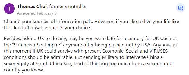 前财务总监,1976年毕业于多伦多大学,工商管理学士,会计专业教授朋友,换个信息来源吧。不过如果你喜欢活在自我中,这虽然有点误导你但这是你的选择。再说,你想要英国做点什么?你可能迟到了一个世纪,因为在被美国赶出去之后,英国已经不是“日不落帝国”了。但不管怎样,如果英国能在目前的经济、社会情况以及大流行的条件下生存下来,那还是令人钦佩的。但说到派遣军队干涉中国在南中国海的主权,你知道的,这对于一个二流国家来说纯属想多了。