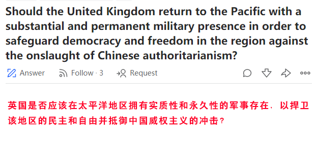 Quora:英国是否应该在太平洋地区拥有军事存在,以捍卫民主自由并抵御中国威权主义的冲击?本文译自Quora,原标题:Should the United Kingdom return to the Pacific with a substantial and permanent military presence in order to safeguard democracy and freedom in the region against the onslaught of Chinese authoritarianism?