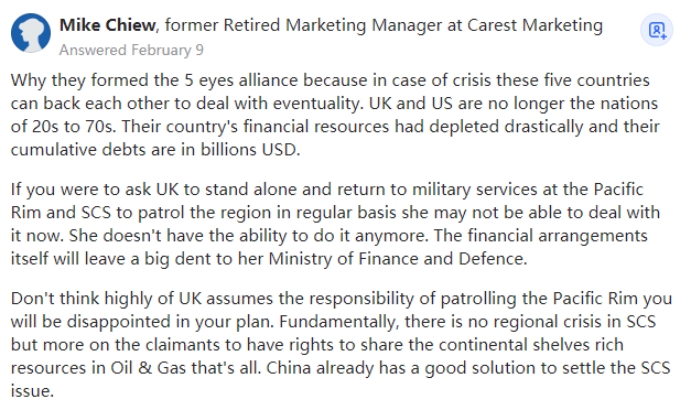 Carest Marketing前退休营销经理,生活在马来西亚吉隆坡他们之所以成立五眼联盟,是因为一旦发生危机,这五个国家可以互相支持,以应对不测。英国和美国不再是上世纪20到70年代的强国了,他们国家的财政资源急剧枯竭,累积的债务高达数万亿美元。如果你要求英国海军单独重返环太平洋和南海地区,并定期巡逻该地区,她现在可能无法应付。她已经没有能力再这样做了,否则这将给她的财政和国防开支留下一个巨大的缺口。不要对英国承担环太平洋巡逻的责任期望过高,否则你会对你的计划感到失望。从根本上说,南海没有区域性危机,更多的是主权声索方在要求分享大陆架上丰富的石油和天然气资源,仅此而已。中国已经有了解决南海问题的好办法。我是英国人。中国在当今世界上是一个比英国要大得多的玩家,我希望中国能取得成功,弥补我国留下的所有烂摊子。然而,我希望中国更公平一些,从历史中吸取一些教训,不要像英国人当年做的那样。former Controller,B.Comm, Profes Accountant from University of TorontoGraduated 1976