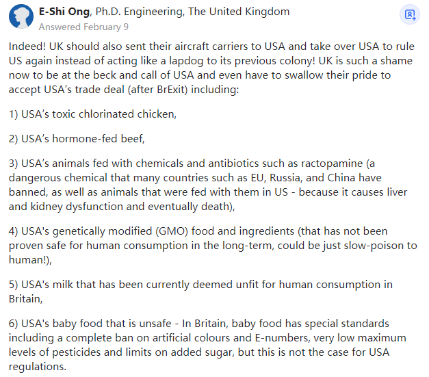 没错!英国还应该派遣他们的航空母舰到美国,接管美国并再次统治他们,而不是在它的前殖民地面前表现得像一只小狗!英国现在听命于美国,甚至不得不忍气吞声地接受与美国的贸易协议(英国脱欧后),包括购买:3) 用化学品和抗生素(如莱克多巴胺,一种危险的化学物质,在许多国家如欧盟、俄罗斯和中国已经被禁止,因为它会导致肝和肾功能障碍,并最终导致死亡)养殖的动物,4) 美国的转基因(GMO)食品和原料(尚未被证明对人类来说长期食用是安全的,可能对人类来说是慢性毒药!),6) 不安全的美国婴儿食品-在英国,婴儿食品有特殊的标准,包括完全禁止人工色素和添加物,农药残留水平非常低,并限制添加糖,但美国没有相应的规定。7) 工厂大规模生产的不安全的全美斯蒂尔顿奶酪(All-American Stilton cheese)和康沃尔肉馅饼(Cornish pasties)。8) 含有过量的杀虫剂和化学物质的美国农产品(大大超过了欧盟等许多国家规定的人体安全限度)。9) 美国还要求英国公平竞争,停止补贴国有企业,例如他们国有的国家医疗服务(NHS)。美国要求英国必须私有化国家医疗服务(NHS),并允许美国公司(如联合健康集团)参与投标和管理(但同时美国自己在补贴波音等美国私营公司!)不仅仅是氯化鸡肉:与美国的贸易协议可能给英国带来的五种食品 | Nick Dearden英国对美洲原住民的种|族|灭|绝、屠杀和谋杀,也是为了保卫从世界其他地方登陆美国的白人殖民侵略者的“民|主和自|由”!他们的论点是,即使白人殖民侵略者不屠杀美洲土著人,他们也会互相残杀,因为他们有许多不同的部落,因为他们不像白人侵略者那样实行“民|主和自|由”!所以他们之间有很多冲突。更妙的是,美国历史教科书试图通过声称大多数美国原住民“死于自然疾病”来洗刷他们在种族灭绝和谋杀印第安人方面的罪行,因为他们太虚弱了,无法抵抗自然疾病!我的天哪!世界其他国家已经对英国、美国等国家所宣扬的“民|主与自|由”有了很好的理解,我们已经厌倦了这种虚伪的,并试图把这种双重标准强塞进我们的喉咙的说教!这不是任何一个正派、正直和有一丁点道德感的人会做的事情!former Retired Marketing Manager at Carest Marketing,Lived in Kuala Lumpur, Malaysia