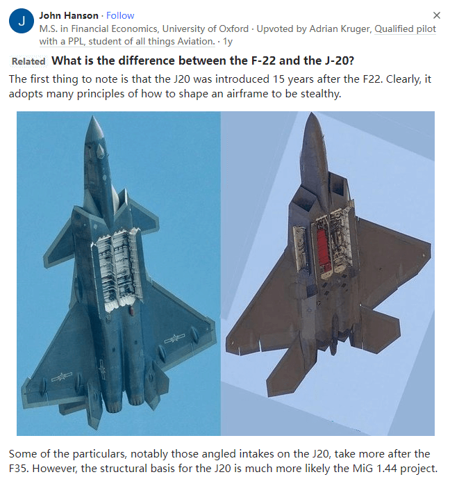M.S. in Financial Economics, University of Oxford首先需要注意的是,J-20是在F-22问世15年后推出的。很明显,它采用了(F-22的)许多塑造隐身机体的原理。一些细节,尤其是J-20上的倾斜进气口更多地参考了F-35。然而,J-20的结构基础更可能源自米格1.44项目。或许这张图更清楚一点。我并不是说中国人“复制”了米格,我只是说J-20显然有米格1.44的“基因”,无论出于何种原因,他们选择采用它们,而不是制造布局更为传统的战斗机。这款米格的原型机建于20世纪90年代,是一款多用途战斗机,而不是像F-22那样的纯空优飞行器。现在,关键的高层次差异是其扮演的角色。F-22最初被设计成一种纯空优战斗机,它将护送隐形轰炸机进入防御空域。而J-20似乎意在携带远程导弹飞越中国附近的海域,攻击敌方的支援船只和军舰。这就是为什么其大部分隐身工作似乎都是从前面进行的,而后面几乎没有——只要看看鸭翼和三角翼之间缺乏后缘对齐,或者看看发动机的暴露程度就知道了。它没有减少红外信号,只有当你打算从自己的领土上起飞,在发射一些远程武器后就返回时,你不需要这些。J-20比F-22大了一点,其内部弹舱显然是为了容纳像PL-15这样的远程导弹,纯空优战斗机不需要这些。除此之外,我相信我们对J-20的了解并不多——我们不知道它在前方的隐身能力如何。我们确实知道其“预期生产的发动机”还没有准备好,因此目前动力不足。它很可能在隐身和航电方面落后于美国的第五代战斗机,但这一说法适用于地球上的每一架飞机。(如果中国生产世界一流的航电设备套件,我们将在其出口战斗机中看到这一迹象)不过,这两架飞机对对方都没有那么大的用处,因为中国不需要进入敌对的防御空域,美国也不需要阻止敌方海军航空兵进入其海岸线。