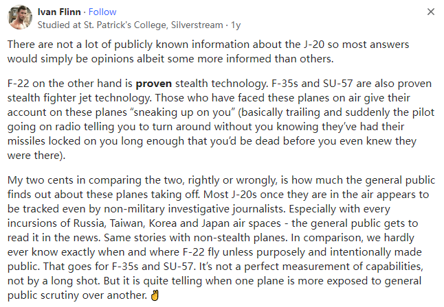 Studied at St. Patrick's College, Silverstream,Lives in Sydney, Australia曾就读于Silverstream圣帕特里克学院,生活在澳大利亚悉尼关于歼-20的公开信息并不多,所以大多数答案都是个人看法,尽管有些人比其他人更了解情况。另一方面,F-22的隐形技术已经被证明过,F-35和SU-57也是经过验证的隐形战斗机。那些在空中面对过这些飞机的人讲述了这些飞机“偷偷向你靠近”的故事(基本上是尾随而来,飞行员在你不知道他们的导弹已经锁定你足够长时间的情况下突然通过无线电告诉你,你甚至在你知道他们在那里之前就已经死了)。无论对错,我将两者进行比较的看法是基于公众对这些飞机起飞的了解程度。大多数时候歼-20在升空后,似乎就会被非军事调查记者追踪到,尤其是对俄罗斯、台湾地区、韩国和日本领空的每一次入侵,公众都能在新闻中看到它,这与非隐形飞机的故事是一样的。相比之下,除非有意公开,我们几乎永远不知道F-22的确切飞行时间和地点,这也适用于F-35和SU-57。虽然这不是对能力的完美衡量,但是当一架飞机比另一架飞机更容易被公众的监视时,这一点就很明显了。✌️