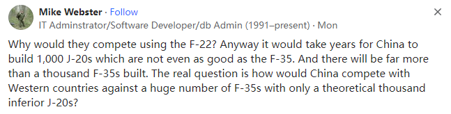 IT Adminstrator/Software Developer/db Admin (1991–present),Lives in Brantford, ONIT管理员/软件开发人员/db管理员(1991年至今),生活在俄勒冈州布兰特福德他们为什么要使用F-22与之竞争?无论如何,中国制造1000架甚至还不如F-35的歼-20需要数年时间。而且,届时将有超过1000架F-35被建造。真正的问题在于中国将如何用理论上只有1000架的劣质歼-20来对抗西方国家数量庞大的F-35?