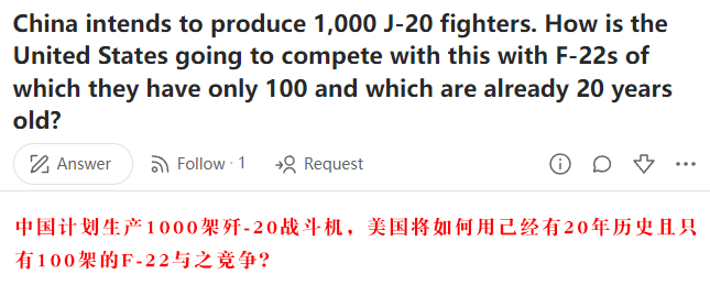 来源:https://www.quora.com/China-intends-to-produce-1-000-J-20-fighters-How-is-the-United-States-going-to-compete-with-this-with-F-22s-of-which-they-have-only-100-and-which-are-already-20-years-old
