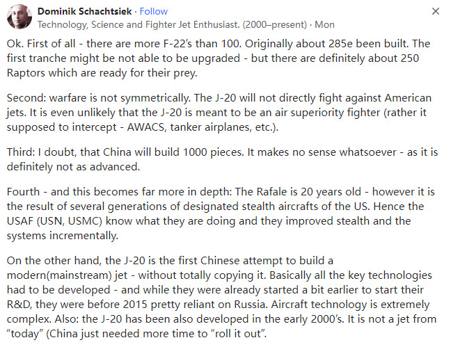 Active in Russian-American Relations地对空导弹比战斗机便宜得多。尽管歼-20对许多当前的西方系统来说是隐身的,但它对S-400这样的俄罗斯系统却不隐身。在未来几年里,西方很有可能掌握探测、跟踪和引导导弹飞向隐形飞机所需的技术。随着这些技术的成熟,战争经济学将转向导弹而非战斗机。Technology, Science and Fighter Jet Enthusiast(2000–present)好吧。首先,F-22的数量超过了100架,它最初大约建造了285架。虽然第一批可能无法升级,但肯定有大约250架猛禽已经准备好迎接猎物。第二:战争不是对称的。歼-20不会直接与美国战斗机作战,歼-20甚至不太可能成为空优战斗机(更确切地说,它的用途应该是拦截预警机、加油机等)。第三:我怀疑中国会建造1000架,这毫无意义——因为它绝对没有那么先进。第四,这变得更加深入:阵风(Rafale)已经有20年的历史了,但它是美国几代关注隐形飞机的结果。因此,美国空军(USN,USMC)知道他们在做什么,并且他们逐步改进了隐形和系统。另一方面,歼-20是中国第一次尝试(而不是完全照搬)制造现代(主流)喷气式飞机,基本上所有关键技术都必须研发出来。尽管他们开始研发的时间稍早,但在2015年之前他们相当依赖俄罗斯,因为飞机的相关技术极其复杂。此外:歼-20也是在2000年代早期研制的,它不是“今天”(today)的喷气式飞机(因为中国需要更多的时间来“推出”它)。第五:美国正在进一步生产大量的F-35,它几乎可以被看作是下一代战斗机,它的战略能力远远超过了“威龙”(即歼-20)!而美国及其盟国的F-35的数量(当中国大量生产歼-20时)也将超过解放军的歼-20。你说的大多数是错误的。J-20项目于1991年开始,花费了很长时间,因为它一直在升级以跟上时代的步伐。F-22是资本主义在最好的阶段的成果,它的价格是J-20的3倍,但它并不比J-20好3倍。它们差不多同样好。它的隐身性可能比J-20更好一点,但也可能不是。然而,它们比我们想象的更接近。