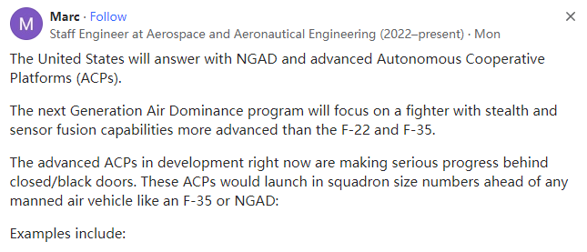 Staff Engineer at Aerospace and Aeronautical Engineering (2022–present),Lives in The United States of America1985–present航空航天和航空工程部工程师(2022年至今),1985年至今生活在美国美国将以“下一代空中优势系统(NGAD)”和“先进的自主合作平台(ACP)”来回应。“下一代空中优势系统(NGAD)”将侧重于一种拥有比F-22和F-35更先进的隐身和传感器融合能力的战斗机。目前正在开发的“先进的自主合作平台(ACP)”正在秘密建造并取得重大进展,这些“先进的自主合作平台(ACP)”将以中队规模的数量在F-35或“下一代空中优势系统(NGAD)”等任何载人飞行器之前升空: