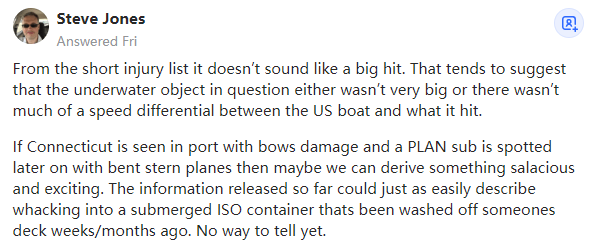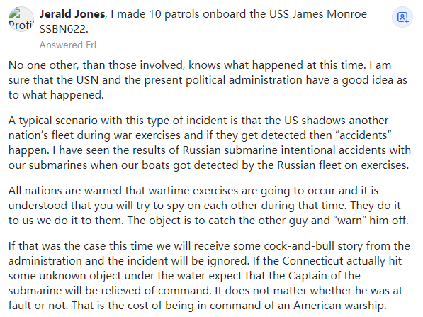 我在詹姆斯·门罗号核潜艇(SSBN622)上巡查过10次,2006年至今生活在印第安纳波利斯除了相关人员之外,没有其他人知道发生了什么。我相信,美国海军和现当局对发生的事情有充分的了解。这类事件的一个典型场景是,美军在演习期间跟踪另一个国家的舰队,如果他们被发现,就会发生一些“事故”。我看到过俄罗斯潜艇故意与我们的潜艇发生事故的结果,当时我们的潜艇在演习中被俄罗斯舰队发现了。所有的国家都收到了实战演习即将开始的警告,不用说,在这段时间内,它们会互相刺探情报。他们对我们做过,我们也对他们这样做过,目的是为了抓住对方并“警告”它离开。如果这一次也是这样的话,我们将从政府那里听到一些胡言乱语,然后这一事件将被掩盖。如果康涅狄格号真的在水下撞到了不明物体,预计潜艇指挥官将被解除指挥权。他是否有错并不重要,这就是指挥美国军舰要付出的代价。鉴于它是康涅狄格号,原因有可能出在海底地形上。我是根据康涅狄格号在水面航行到关岛期间的照片得出这一结论的,据美国海军称,它现在就在关岛。首先,损坏发生在船底,它的声纳罩完好无损。因此,撞击发生在吃水线以下,不涉及船只的“鼻头”,否则声纳罩将不会保持完好。第二,船体没有破裂,也没有变形,因为她在水面航行的过程中伴随着标准和完整的波纹。第三,这些损伤与撞击软底面造成的损伤是一致的,即动能的突然转移导致船的航向迅速向上移动。这么大质量的东西可不是开玩笑的,在船头的(船员们)会被非常用力地抛到舱顶。这次除了有人腿骨折外,其他极少数受伤的船员也有同样类型的伤。而且这种推测是合情合理的。我无法准确猜测康涅狄格号在那里遭遇了什么,但在过去30年中,那里的海底地形有了重大变化,那里至少发生过3次大的火山喷发,20次伴随着地震的重大地质构造变化,多次资源钻探作业,大规模的疏浚作业等,美国潜艇在该地区使用的高分辨率海图很可能不准确。如果是与另一艘潜艇或大的岩石碰撞,甚至是与钻井平台碰撞,损坏将是显而易见的,它们将无法以如此快的速度航行,并会有明显的舰队伴随护送。相反,由于潜艇上只有11名船员受伤,所以它进行了一次不到6天时间的水面航行,美国海军的说法是“它撞上了一个集装箱或沉船”,这意味着发生这种情况时它正在海底航行。此外,该地区目前还没有传出另一艘潜艇或钻井平台发生事故的消息。