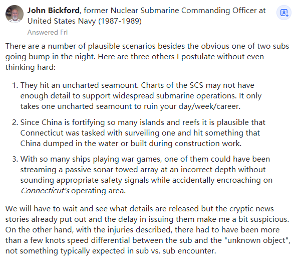 美国海军前核潜艇指挥官(1987-1989年),2017年至今生活在华盛顿州肯纳维克这里还有一些合理的猜测。以下是我不费吹灰之力就想出的三个其他的假设:1. 他们撞上了一个未知的海山。南中国海的海图可能没有足够的细节来支持大范围的潜艇行动。只需要一个未知的海山就可以毁掉你的一天/一周/或者整个职业生涯。2. 由于中国正在加固如此多的岛屿和暗礁,康涅狄格号有可能被派去监视其中一个,并撞上了中国倾倒在水中或在施工期间建造的东西。3. 由于有这么多军舰在进行战争演习,其中一艘可能在无意中侵入了康涅狄格号的作业区,并将被动声纳拖曳阵列置于错误的深度,而没有发出适当的安全信号。我们将不得不等待,看看他们发布了什么细节,但已经发布的含义隐晦的新闻故事和延迟发布的做法让我有点怀疑。另一方面,根据所公布的受伤情况,潜艇和“未知物体”之间的速度差异肯定不止几节,而这在潜艇与潜艇的遭遇中通常不会出现。