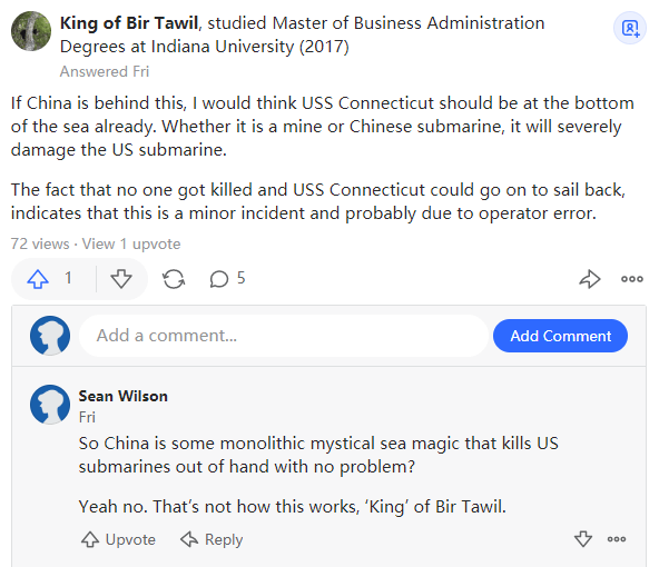 继续!把一切都归咎于中国,我想他们对这种指控已经“完全麻木”了。除非调查完成,否则我们可能不会知道谁是罪魁祸首,我们可能永远也不会知道。海洋中有很多地方都没有精确绘制的海图。为什么要把发生的一切坏事都自然而然地归咎于中国!这可能只是由于一个简单的导航错误造成的事故,或者他们使用的海图上包含了错误的信息。不,这是由于导航问题造成的。上一次已知的美国潜艇撞击另一个水下物体的事件发生在2005年。当时,美国潜艇旧金山号(SSN-711)全速撞上了关岛附近的一座水下山脉,一名水手在那次事件中丧生。由于一艘美国“最先进”的核潜艇遭遇了事故,因此你就将此归咎于中国?它们并没有被邀请进入该地区,也没有被邀请去撞击障碍物,而你却指责该地区的国家?这就好比你偷偷溜进别人的院子然后被狗咬了,你却责怪房主?责怪你自己吧,这是因果报应,没有其他人应该受到责怪,更不用说中国了。别再像美国对待新冠肺炎那样玩弄指责游戏了。官方消息人士说,这艘潜艇状况良好,没有危险,它的反应堆没有受到影响。所以…请你解释一下你为什么要提出这样一个夸张的问题?如果是这样,美国应该为泰坦尼克号在北大西洋的沉没负责吗?哪里是“中国的后院”?是什么让你认为康涅狄格号在“中国的后院里”?亚洲的任何地方都不是美国的后院!请你们这些战争贩子远离亚洲!
