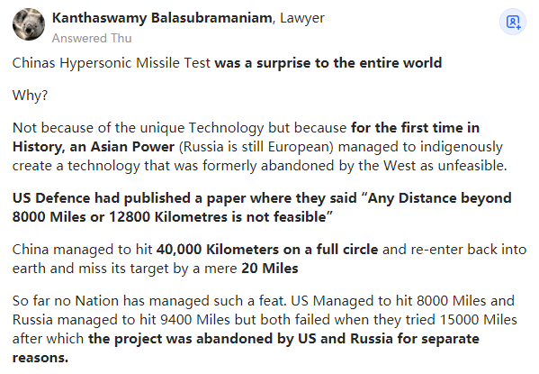 Kanthaswamy BalasubramaniamLawyer,Lives in Chennai, Tamil Nadu, India不是因为这项技术独一无二,而是因为这是历史上第一次,一个亚洲大国(俄罗斯仍然是个欧洲国家)成功地在本国创造了一种以前被西方视为不可行的技术。美国国防部曾经发表过一篇论文,称“任何超过8000英里或12800公里的距离都是不可行的”。但中国成功地完成了一整圈环球飞行,并在飞行了40000公里后重新进入地球大气层,仅偏离了目标20英里。到目前为止,还没有一个国家能做到这一点。虽然美国设法达到了8000英里,俄罗斯设法达到了9400英里,但两个国家都在尝试15000英里时失败了,此后该项目因不同原因被美国和俄罗斯放弃。令人印象深刻的是中国公开承认没有击中目标,即使只偏离了目标32公里。不过媒体表示,即使它偏离了目标32公里,但对于核导弹而言依然是有效的。中国的发言人说:我们有一个目标,但我们错过了,下次我们不会再错过。这是我自2015年以来看到的一种新的态度,他们不再隐瞒。科兴公司的疫苗的有效性仅为50.4%,我们偏离了目标32公里,我们正面临电力危机......然而,这不是一个人造卫星时刻(Sputnik Moment)。因为这项技术不是中国发明的,这也不是有史以来第一次高超音速导弹测试。美国和俄罗斯都在更早的时候成功地用高超音速导弹测试并击中了它们的目标,尽管它们的飞行距离要短得多。比如说,如果明天你发明了一款每次充电可以跑1000公里的用于电动汽车的电池,你会欢呼电动汽车电池很棒,但你会说你赢得了电动汽车竞赛吗?不,电动汽车竞赛是由第一批电动汽车制造商赢得的,它们像特斯拉一样销售电动汽车。目前,中国是唯一一个射程达到40000公里并几乎命中目标的国家。美国甚至在15000英里时就放弃了,而且那是很久以前的事了。