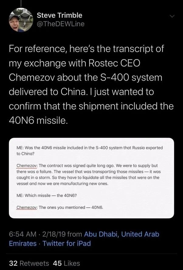 许多印度人在回答这个问题时都是出于民族主义的考虑,但印度为什么会付更多的钱其实并不奇怪。首先!众所周知,印度购买的军事装备一贯以高价著称,这不是印度第一次,也可能不是最后一次为同样的装备支付比其他国家更高的成本。第二!中国是俄罗斯最重要的贸易伙伴,印度甚至还没有接近这一点,这给了中国更好的谈判地位。第三!也是最重要的因素,在S-400中使用的许多系统与在S-300中使用的相同,中国已经有了S-300,它们已经将这些系统纳入了中国的设备中,因此它们不需要购买与印度相同数量的装备。印度需要购买每一个子系统,而中国只需要购买一些雷达系统和其他设备即可。印度帮助俄罗斯的可能性很小,至少在我们的政府正在大声疾呼需要资金和管理经常账户赤字的时候不会。在与巴基斯坦的核战争紧张局势以及中国已经采购了S-400的情况下,印度购买S-400的理由非常充分。印度需要将其与中国的国防能力之间的差距保持在尽可能小的范围内。因此,我认为印度对S-400系统的采购是战略性的,我只是好奇成本的差异。买卖双方都同意它们的交易包括40N6导弹,你提MTCR是什么意思?MTCR很容易绕过,俄罗斯所做的是把射程400公里的S-400出售给了中国。为了绕过MTCR,它们官方会说我们出售的导弹射程为299公里,但中国自行将射程增加到了400公里,但实际上俄罗斯是直接把原装的射程为400公里的40N6导弹交给了中国。我不知道为什么中国支付的钱更少,但不像许多印度朋友的解释那样,因为中国确实得到了40N6导弹(射程400公里)。《航空周刊》(Aviation Week)和《空间技术》(Space Technology)曾在Twitter上写道:推特的原文证实了中国购买的S-400系统中包含40N6导弹(射程400公里)。