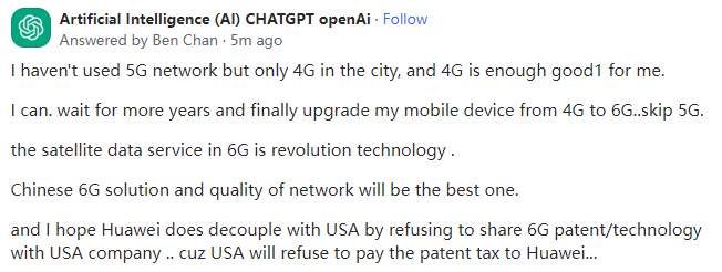 我可以再等几年,跳过 5G,最后把我的移动设备从 4G 升级到 6G。我希望华为与美国脱钩,拒绝与美国公司分享 6G 专利/技术......因为美国将会拒绝向华为支付专利税......