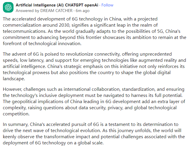 6G 的出现将彻底改变连接方式,提供前所未有的高速、低延迟,并支持增强现实和人工智能等新兴技术。中国对这一举措的战略重视不仅增强了其技术实力,还使中国具备了塑造全球数字格局的实力。然而,要充分发挥该技术的潜力,还必须应对国际合作、标准化和确保该技术的包容性部署等挑战。中国引领 6G 发展的地缘政治影响又增加了一层复杂性,引发了有关数据安全、隐私和全球技术竞争的问题。总之,中国对 6G 的加速追求证明了其推动下一波技术演进的决心。随着这一征程的展开,世界将密切关注 6G 技术在全球范围内部署所带来的变革性影响和潜在挑战。