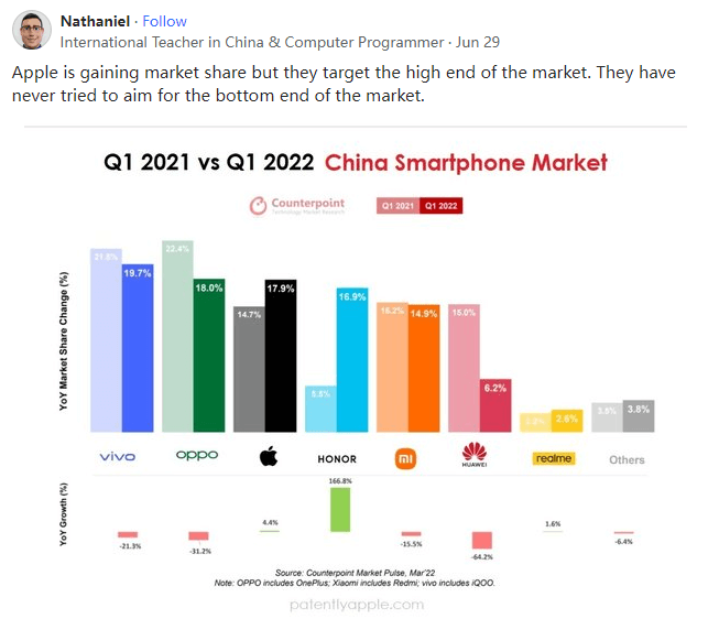 美国品牌、德国品牌、挪威品牌、印度品牌——他们真的不在乎。只要人们购买你的产品,你就可以在中国市场成为第一,即便你的国家每天都在政治上与中国发生争执。明天,如果Jio(译注:印度电信公司)创造出了最好的手机,中国人也会蜂拥而至购买这些手机---即使印度和中国存在大规模的边界争端。如果这些手机在中国市场成为第一,中国也不会有任何意见。明天,如果苹果卖得这么好,华为向政府抱怨,政府会问华为:“你疯了吗?别向我们抱怨,有本事为人民创造更好的产品。”只要你在各种政|治|议|题上闭嘴,或者拒绝听从你的疯狂领|导|人抵制XJ棉花的建议,你就可以完全在自由贸易的支持下发展和赚钱。可能会,也可能不会。中国智能手机市场的发展速度远快于全球智能手机市场,事实上,在2017年,15项手机创新中有14项来自美国/欧洲或韩国,来自中国的只有1项。而在2022年,15项创新中只有6项来自以上这些国家,有9项来自中国。他们在短短5年内就从6%达到了60%!!!!当然。除非苹果的首席执行官谈论XJ或人|权等胡言乱语。如果你问起推特或脸书在中国的遭遇,那是因为它们干|涉|政|治。
