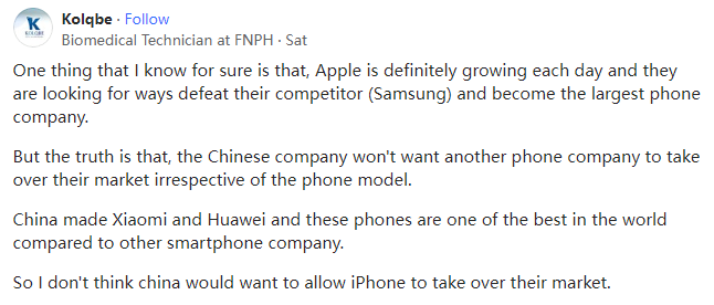 FNPH的生物医学技术员,2000年至今生活在尼日利亚Edo的贝宁城我可以肯定的是,苹果手机的销量每天都在增长,它们正在寻找打败其竞争对手(三星)并成为世界上最大的手机公司的方法。但事实是,无论手机型号如何,中国的手机公司都不会希望另一家手机公司接管他们的市场。与其他智能手机公司相比,中国制造的小米和华为是世界上最好的手机之一。所以我不认为中国会允许iPhone接管他们的市场。