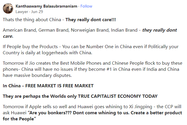 当印度在中国的应用程序取得成功并在其市场上运行后禁止这些应用程序时,印度人似乎没有太多抱怨。至少从第一天起,中国就明确了在中国市场运作所需的法规,这些外国公司要么进行调整,要么退出中国市场,这些公司做出了自己的选择。