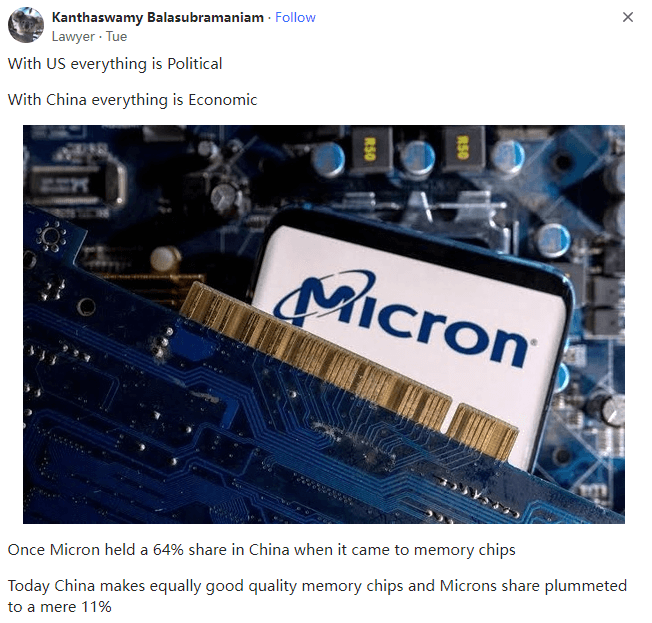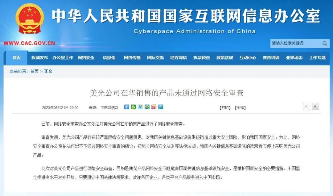 美光未通过网络安全审查:中国终于开始以其人之道还治其人之身,打响反制第一枪了吗?本文译自Quora,原标题:What are your thoughts on China's ban on Micron Technology's memory chips?据中国网信网21日消息,日前,网络安全审查办公室依法对美光公司在华销售产品进行了网络安全审查。审查发现,美光公司产品存在较严重网络安全问题隐患,对我国关键信息基础设施供应链造成重大安全风险,影响我国国家安全。为此,网络安全审查办公室依法作出不予通过网络安全审查的结论。按照《网络安全法》等法律法规,我国内关键信息基础设施的运营者应停止采购美光公司产品。此次对美光公司产品进行网络安全审查,目的是防范产品网络安全问题危害国家关键信息基础设施安全,是维护国家安全的必要措施。中国坚定推进高水平对外开放,只要遵守中国法律法规要求,欢迎各国企业、各类平台产品服务进入中国市场。美光(Micron)是一家存储芯片公司,主要产品是NAND存储芯片和固态硬盘。根据CFM闪存市场数据,2022年四季度,美光在全球DRAM市场的份额为23.3%,排名第三;在全球NAND Flash市场的份额为10.5%,排名第五,该公司也是美国少有的存储制造商。今年3月31日,网络安全审查办公室表示,为保障关键信息基础设施供应链安全,防范产品问题隐患造成网络安全风险,维护国家安全,依据《中华人民共和国国家安全法》《中华人民共和国网络安全法》,网络安全审查办公室按照《网络安全审查办法》,对美光公司在华销售的产品实施网络安全审查。Kanthaswamy BalasubramaniamLawyer,Lives in Chennai, Tamil Nadu, India在存储芯片领域,美光曾在中国占有64%的市场份额。如今,中国生产的存储芯片质量同样好,美光的市场份额已暴跌至11%。中国现在认为禁止美光的销售是合理的,因为它已经提高了技术水平,中国可以利用其制造力量来增加国内存储芯片的产量以取代外国芯片。然后,中国可以实现跨越并在技术上发展到下一个水平,提升自己的核心存储器技术并超越过去十年研究停滞不前的美国,这一切都是为了升级和更多的升级。而中国首先整理其经济,在一切都规划清楚后才开始慢慢搞政治。美国对沙特进行了几十年的镇压,最后只得到了冲突和分裂。而中国签署了《商业协议》、《石油协议》,这些协议极大地提升了双方的经济,然后在伊朗与沙特的和平中迅速引入了政治因素。
