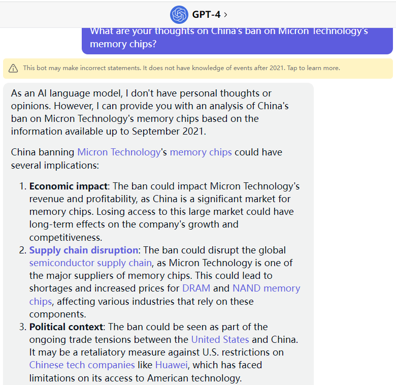 作为一个AI语言模型,我没有个人的想法和看法。但是,我可以根据截至 2021 年 9 月的可用信息,为您分析中国对美光科技存储芯片的禁令。中国禁止美光科技的存储芯片可能会产生以下几个影响:1.经济影响:该禁令可能会影响美光科技的收入和盈利能力,因为中国是存储芯片的重要市场,失去进入这个庞大市场的机会可能会对公司的发展和竞争力产生长期影响。2.供应链中断:该禁令可能会扰乱全球半导体供应链,因为美光科技是内存芯片的主要供应商之一。这可能导致DRAM和NAND 存储芯片短缺和价格上涨,影响依赖这些组件的各个行业。3.政治背景:该禁令可被视为美国和中国之间持续的贸易紧张局势的一部分,这可能是对美国限制华为等中国科技公司的报复措施,因为华为在获取美国技术方面面临限制。4.技术竞争:该禁令可能会推动中国进一步投资国内半导体行业以减少对美光科技等外国供应商的依赖,这可能会导致对美光和其他非中国存储芯片生产商的竞争加剧。5.全球技术格局:该禁令可能进一步凸显美国和中国在技术领域日益扩大的分歧,这可能会加剧现有的“科技冷战”并导致全球科技格局出现分叉,企业和国家将不得不选边站。请记住,此分析基于截至 2021 年 9 月的可用信息,此后情况可能有所变化。