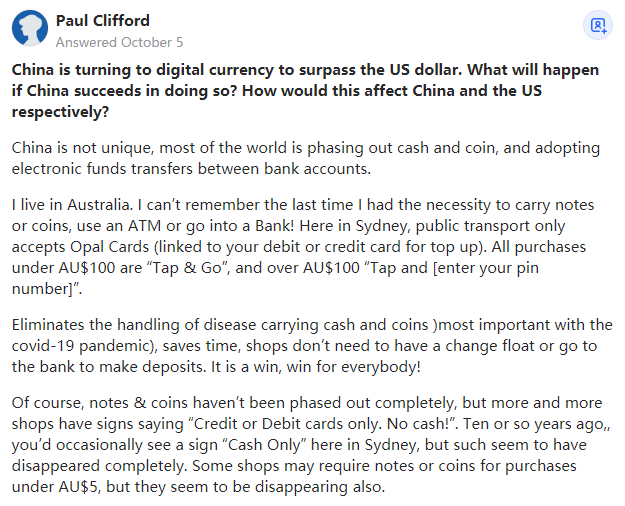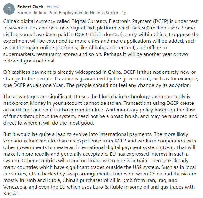 Former Retired. Prior Employment in Finance Sector,Lived in Lived in Singapore中国的数字货币即“数字货币电子支付系统”(DCEP)正在多个城市和一个拥有5亿用户的新型数字平台“滴滴”上进行测试,一些公务员已经通过这一系统领到了薪酬。这项测试目前只在中国境内进行,我认为很快将扩展到更多的城市,并将添加到更多的应用程序上,例如在阿里巴巴和腾讯等主要的在线平台以及超市、餐馆、商店等的线下场景。也许再过一两年它会在全国铺开。