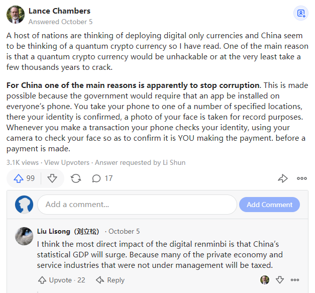 我认为,数字人民币最直接的影响是中国的GDP将激增,因为许多不在管理之下的私营经济和服务业将被征税。