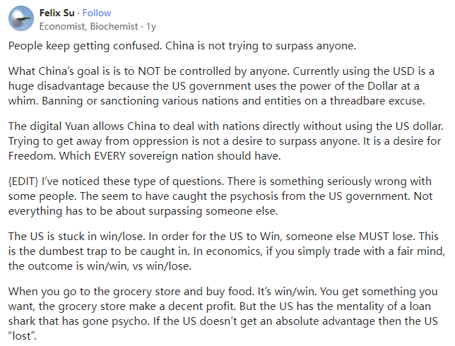 Economist, Biochemist,Lives in Revere, MA中国的目标是不受任何人的控制。目前使用美元(对中国而言)是一个巨大的劣势,因为美国政府会任性地使用美元的力量,以陈词滥调禁止或制裁各个国家和实体。数字人民币可以让中国在不使用美元的情况下直接与各国打交道。试图摆脱压迫并不意味着想超越任何人,这只是对自由的渴望,这是每个主权国家都应该拥有的权利。{编辑}我注意到了这类问题。有些人存在严重的问题,他们似乎从美国政府那里染上了精神疾病,不是别人做的每件事都是要超越别人。美国陷入了输/赢的困境。为了让美国赢,就必须有其他人输,这是最愚蠢的陷阱。在经济学中,如果你能以公平的心态进行交易,结果将是双赢,而不是有人输/有人赢。当你去杂货店买食物的时候,这就是双赢,因为你得到了你想要的东西,杂货店也获得了可观的利润。但美国的心态就像一个精神错乱的高利贷者,如果美国没有获得绝对的优势,那就意味着美国“输了”。这样的交易是不可持续的。即使你赢了,实际上你也输了,因为你必须为军队花费不成比例的钱来确保你们一直“赢”。这会让其他人不想和你打交道,从长远来看你会成为最大的失败者。所以我注意到这种高利贷心理似乎感染了很多美国人,这对美国来说不是个好兆头。