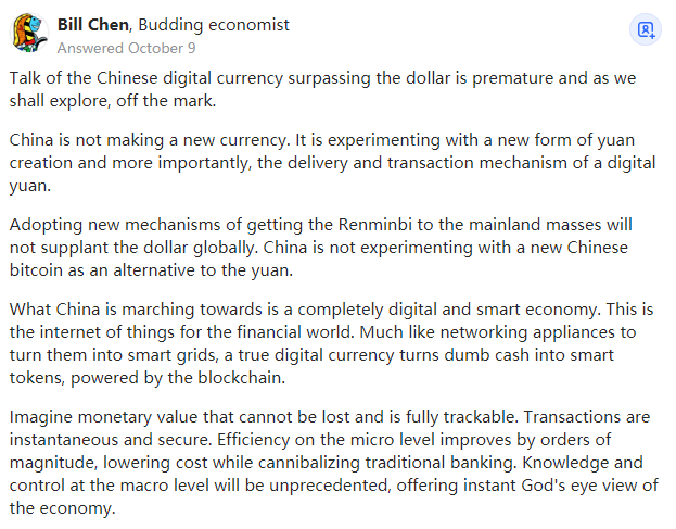 Budding economist,Lives in Singapore关于中国数字货币超过美元的讨论还为时过早,正如我们将要探讨的那样,这不是重点。
