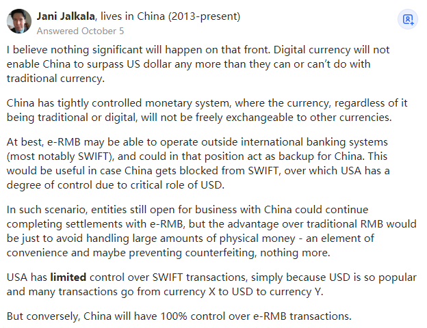 lives in China (2013-present)我相信在这方面不会发生什么重大的事情。数字货币不会使人民币超过美元,就像他们在使用传统货币的时候一样。