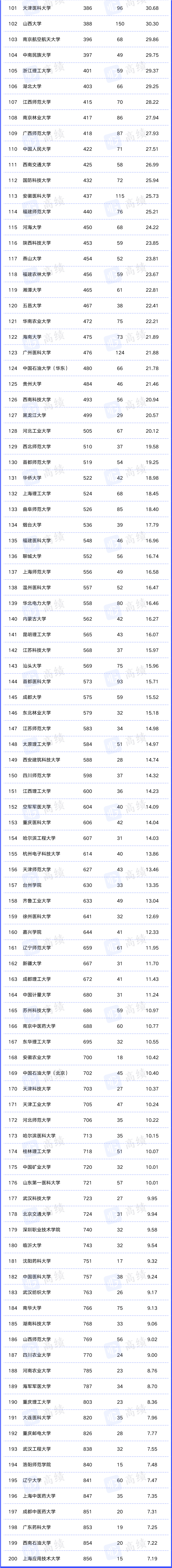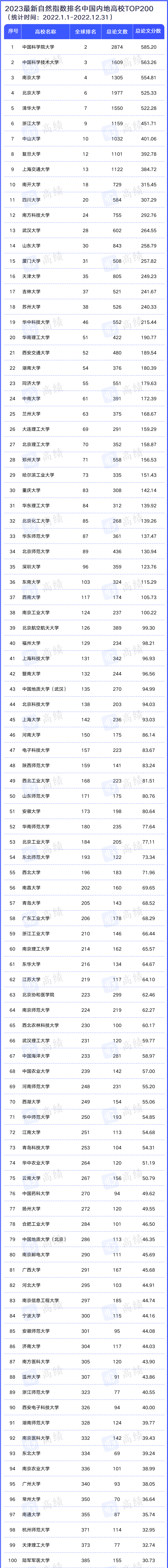2023最新自然指数排名公布!网友热议研究成果排名前20的机构中有10所在中国本文译自Quora,原标题:Ten of the top 20 universities by research output are in China自然指数官网更新了最新的自然指数排名(统计时间节点为2022.1.1-2022.12.31)。最新自然指数排名中,哈佛大学位居全球高校第一,中国科学院大学位居全球高校第2,内地高校第1位。自然指数(Nature Index)于2014年11月首次发布,是依托于全球顶级期刊(《自然》系列、《科学》《细胞》等82种自然科学类期刊),统计各高校、科研院所(国家)在国际上最具影响力的研究型学术期刊上发表论文数量的数据库。运用这个数据库,可以根据各机构的论文发表数量及类别来进行排名和期刊索引。目前,自然指数已发展成为国际公认的能够衡量机构、国家和地区在自然科学领域的高质量研究产出与合作情况的重要指标,在全球范围内有较大影响力。中国内地高校中,排名前10的有中国科学院大学、中国科学技术大学、南京大学、北京大学、清华大学、浙江大学、中山大学、复旦大学、上海交通大学和南开大学。以上10所高校加上四川大学、南方科技大学、武汉大学、山东大学、厦门大学、天津大学、吉林大学、苏州大学和华中科技大学,共计19校进入全球高校排名前50。非“双一流”高校中,深圳大学、南京工业大学、山东师范大学、青岛大学、广东工业大学、浙江工业大学、江苏大学、河南师范大学、西湖大学、青岛科技大学、扬州大学和河北大学,这12所高校同样表现优异,位居全球高校前300。2023最新自然指数排名中国内地高校TOP200名单(2022.1.1-2022.12.31)如下: