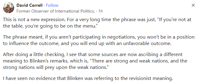 来源:https://www.quora.com/What-do-you-think-of-U-S-Secretary-of-State-Antony-Blinkens-theory-of-If-youre-not-at-the-table-in-the-international-system-youre-going-to-be-on-the-menu
