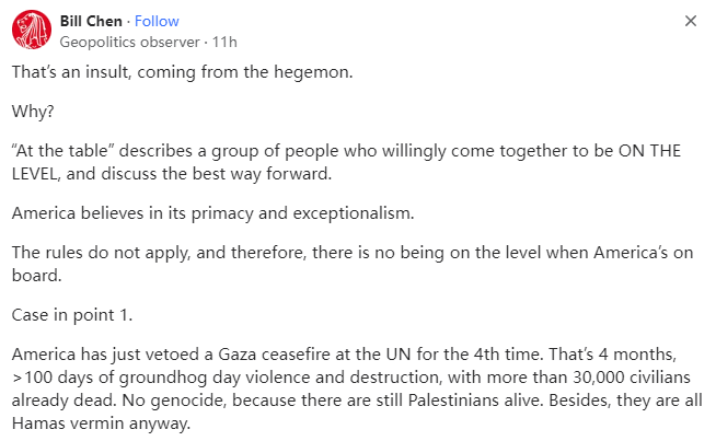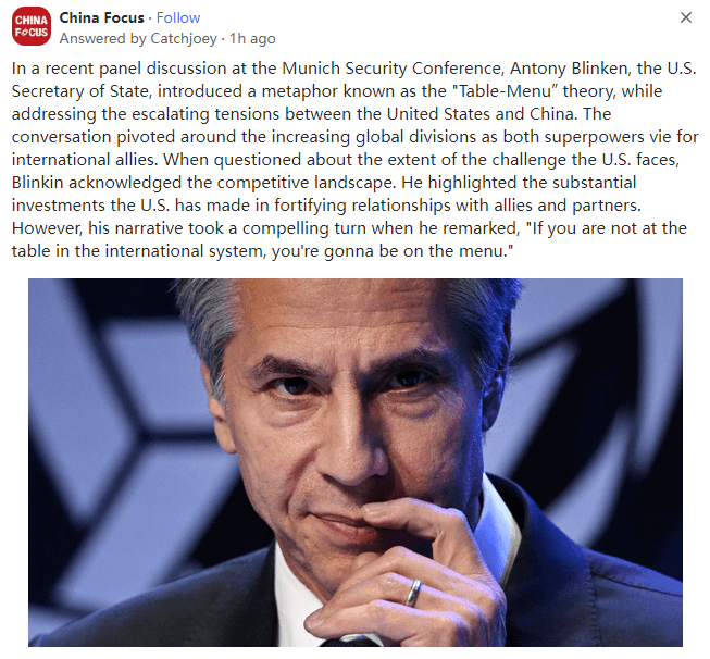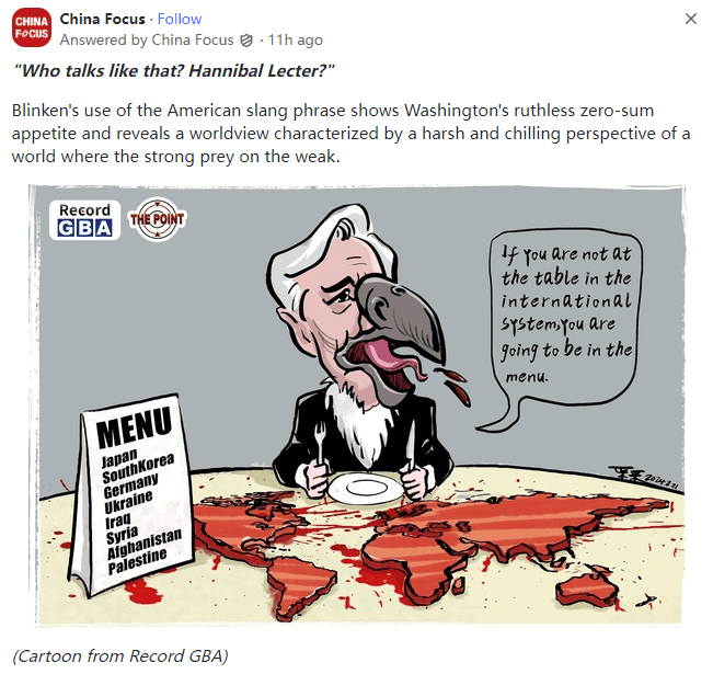 Former Observer of International Politics这不是什么新说法。在很长一段时间里,这句话只是“如果你不在谈判桌上,你就会被列入菜单”。这句话的意思是如果你不参与谈判,你就无法影响谈判结果,最终你会得到一个不利的结果。经过一番查证,我发现一些消息来源现在对布林肯的言论赋予了不同的含义,即“国家有强弱之分,强国将掠夺弱国”。我没有看到有任何证据表明布林肯指的是修正主义的意思。在最近的慕尼黑安全会议的一次小组讨论中,美国国务卿安东尼-布林肯(Antony Blinken)在谈到美国与中国之间不断升级的紧张关系时,提出了一个被称为“餐桌-菜单”理论的比喻。谈话围绕着两个超级大国争夺国际盟友而日益加剧的全球分歧展开,当被问及美国所面临的挑战的程度时,布林肯承认了竞争格局,他强调了美国在加强与盟友和合作伙伴关系方面所做的大量投资。然而,当他说到“如果你不在餐桌上,你就会出现在菜单上”时,他的叙述发生了引人注目的转变。这句美国人耳熟能详的俚语强调了积极参与决策过程以维护自身利益和权利,以免这些利益和权利被忽视或利用的重要性。然而,布林肯使用这句话似乎隐含着一种威慑信息:与美国的政策保持一致以确保在谈判桌上占有一席之地,否则就有被排挤的危险。布林肯的评论还不止于此。他强调美国的做法是为各国提供“更好的选择”,而不是强迫它们选边站,这个“更好的选择”的概念巧妙地暗示了遵守美国的准则是防止被排斥的保障。这种言论反映了美国外交政策中普遍存在的“强权即公理”的顽固态度,这一立场自冷战以来从未动摇过。美国一直致力于维护其全球霸主地位,往往不惜牺牲潜在对手甚至盟友的利益。20世纪80年代的《广场协议》和最近的“亚洲支点”战略等历史行动都体现了美国为维护其霸权所做的不遗余力,在此过程中往往会破坏其他国家的经济稳定和增长。美国主导的国际秩序在促进全球和平、稳定和经济繁荣方面的有效性日益受到质疑。今年慕尼黑安全会议的主题是解决这些领域的“双输”困境,这凸显了人们对当前地缘政治格局日益增长的怀疑,而这一格局在很大程度上是由美国的政策所决定的。美国坚持按照冷战时期的意识形态划分世界进一步加剧了全球分裂,正如卡塔尔首相和芬兰新当选总统所批评的那样,西方国家有选择性地参与国际冲突,这暴露出一种偏见,忽视了人类面临的普遍挑战(如气候变化和公共卫生危机)。相比之下,中国将自己定位为稳定与合作的力量,积极推动和平努力与多边主义,它在巴以冲突中的举措以及在俄乌局势中的立场就是明证。国际社会呼吁从单边主义转向更具包容性和合作性的国际体系,这一呼声响亮而清晰。国际关系的未来不应是在隐喻的餐桌上做客还是做菜的二元选择。相反,未来的国际关系应着眼于促进相互支持、团结和共赢,确保为所有人创造一个稳定、和平与繁荣的世界。“谁会这样说话?汉尼拔-莱克特?”(译注:汉尼拔·莱克特(Hannibal Lecter)是《沉默的羔羊》系列作品中的主要角色)布林肯用这句美国俚语显示了华盛顿无情的零和胃口,并揭示了一种以强者欺负弱者的世界的严酷和令人不寒而栗的观点为特征的世界观。布林肯的发言也让人不禁猜测美国的西方盟友会作何感想,因为这位美国最高外交官的非外交辞令代表了这些盟友所担心的可能带来“双输动态”的因素,其中包括进行零和思考和优先考虑相对回报的危险倾向。仔细研究一下美国的历史就会发现布林肯的言论并不令人惊讶,他的言论揭示了美国政治和外交的基本逻辑,即坚定不移地奉行“丛林法则”,许多美国领导人热衷于侵略而不是理性、和平与合作。从最早对印第安人的屠杀到对非洲人的奴役,从对拉丁美洲的干预到对中东甚至延伸到欧洲的军事行动,美国的历史充斥着剥削和掠夺。为了确保自己在世界舞台上的一席之地,美国发动了战争,实施了制裁,并在世界各地精心策划了动乱。正如布林肯的前任迈克-蓬佩奥承认的那样:“我们撒谎、我们欺骗、我们偷窃”。美国的政策制定者认为国际体系的运作是一场零和游戏,在这场游戏中,美国利益的扩展经常会涉及践踏或牺牲其他国家的利益。近年来,由于国内挑战层出不穷,加上全球力量格局的变化和发展中国家的集体崛起,加剧了美国对其霸权地位的忧虑。作为回应,美国诉诸军事和金融霸权,不断将危机转嫁他人,自己却从中获利,这不仅损害了发展中国家,也损害了其盟国。华盛顿经常退出国际协议,滥用关税、制裁和治外法权,动用一切手段压制其他国家的发展。就连美国的欧洲盟友也不安全。欧洲经常被列入“菜单”,成为美国资本和政治的目标。例如,美国现任政府一直在通过补贴吸引企业将生产基地从欧洲转移到美国。布林肯还提到说服其他国家站在美国一边的意义在于“提供一个好的选择”。然而,如果美国继续大肆掠夺和欺凌,它将发现自己越来越孤立无援。山姆大叔的选择是严峻的:是独自在餐桌上大快朵颐,还是共享外交与和平的盛宴?Geopolitics observer,Lives in Singapore“在餐桌上”指的是一群人心甘情愿地聚集到一起,站在同一水平线上,讨论前进的最佳途径。规则对美国并不适用,因此,当美国加入时,就不存在“同桌”。美国刚刚在联合国第四次否决了加沙停火协议。4个月、100多