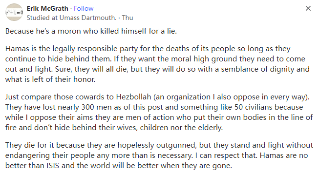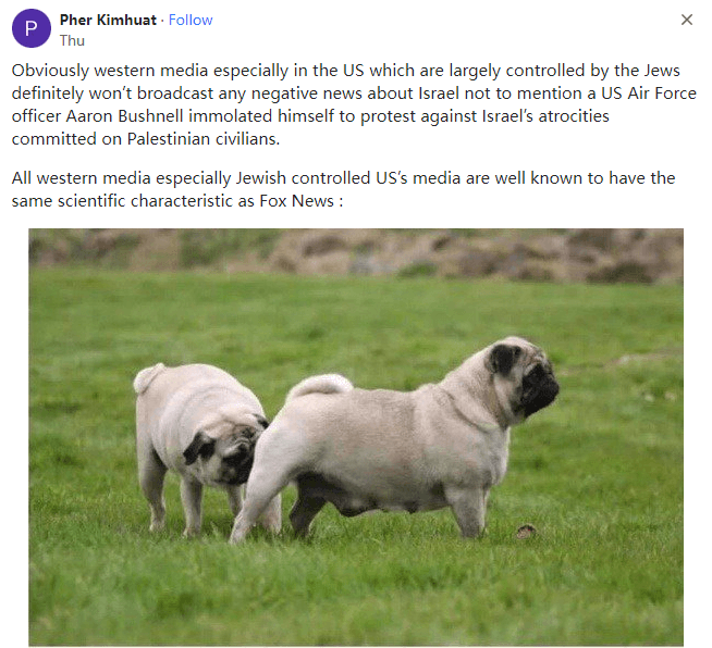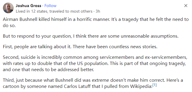 Quora:为什么很少有人谈论美国飞行员亚伦-布什内尔(Aaron Bushnell)为抗议以色列对巴勒斯坦平民的暴行而自焚的事件(1)?本文译自Quora,原标题:Why are so few people talking about the self-immolation of U.S. airman Aaron Bushnell in protest of Israel's atrocities committed against Palestinian civilians?BS in Mathematics & Computer Science, University of Chicago (Graduated 1995)Quora上的网友大部分都是美国人,美国人一般不会对自杀式抗议留下深刻印象。好的修辞是针对受众的,你可能有一套波兰人的笑话,但波兰观众不会喜欢。自杀式抗议更像是东方人的事,原因你可以用谷歌搜索一下。对美国人来说,亚伦-布什内尔是一个妄想的、误入歧途的疯子,也许他受到了敌对行为者的操纵。就“推动”或“改变”美国而言,他的死毫无用处,很快就会被人遗忘。美国人更喜欢在不可能的情况下孤注一掷并取得微小的成功。说得好!我在想:如果这个人愿意以最痛苦的方式做出终极牺牲,他为什么只喊几句空洞的口号?他为什么不向公众展示迫使他自焚的信息?在我看来,他的行为在某种意义上是英勇的,但最终却是愚蠢和无用的。Worked at U.S. Army,Lives in Columbus, GA这个故事唯一可悲的部分是美国纳税人集体承担了他的治疗费用。通过自焚来抗议世界大事是有时间和地点限制的,现在不是时候,对美国人来说不是,因为我们真的没有参与其中,他真的做得太过火了。一般来说,能进空军的人都不会那么蠢。Studied at Umass Dartmouth只要哈马斯继续躲在背后,他们就必须为其人民的死亡承担法律责任。如果他们想占据道德制高点,就必须站出来战斗。无疑,他们都会死,但他们会带着尊严和仅存的荣誉去死。把这些懦夫与真主党(我也从各方面反对该组织)相比就知道了。虽然我反对他们的目标,但他们是有行动力的人,他们将自己的身体置于火线之上,不会躲在妻子、孩子或老人身后。他们为国捐躯,因为他们的武器根本无法与以色列匹敌,但他们坚持战斗,没有给自己的人民带来任何不必要的危险,我对此表示敬意。哈马斯并不比伊斯兰国好到哪里去,当他们消失的时候,世界会变得更好。Lived in 12 states, traveled to most others飞行员布什内尔以一种可怕的方式自杀了。他认为有必要这样做,这是一个悲剧。其次,自杀在军人和退役军人中非常普遍,他们的自杀率是美国人口自杀率的两倍。这是正在发生的悲剧的一部分,需要更好地加以解决。第三,布什内尔的做法虽然极端,但并不代表他就是正确的。下面是我从维基百科上摘录的卡洛斯-拉图夫(Carlos Latuff)的漫画:但这有问题,首先是释广德(Thích Quảng Đức)并不是在抗议种族灭绝,他抗议的是非常明显和绝对的宗教歧视,这在以色列是没有的:非犹太公民享有与犹太公民同等的权利。当然,加沙也没有发生任何种族灭绝。有偏见的媒体报道指出了加沙政府蓄意针对平民实施暴行的后果,但却贴上了“不公平”的标签。10月7日的袭击与其说是“证明”以色列的反应是合理的,不如说是它要求以色列这样做,而且被哈马斯扣留的人质至今仍未获释。虽然我对以色列的反应有意见,但转念一想,如果美国遭到邻国的入侵,入侵者折磨、强奸并杀害了上千名美国男子、妇女和儿童,我希望我们的政府会怎么做?整个国家都会要求杀死罪犯,要求政府采取行动防止此类事件再次发生。我对以色列的反应表示担忧,我不庆祝爆炸或平民死亡,但哈马斯并没有投降,他们仍在劫持人质,仍在攻击以色列,仍在偷窃食物、燃料和其他资源,(当然)仍在战斗。鉴于哈马斯公开、大声地承诺要进行真正的种族灭绝,要彻底摧毁以色列国,因此哈马斯是一个持续存在的危险。新闻报道极少提及以色列士兵开火是因为他们遇到了武装反击,他们是在还击,这在战争中是允许的。9-11事件后,我们入侵了两个对袭击事件没有直接责任的国家,造成约30万伊拉克平民死亡,还有许多人死于阿富汗,而我们的人口中只有不到0.001%的人丧生。我无法想象,如果有13倍的美国人不仅被杀害,还遭到强奸、折磨和绑架,我们会怎么做。如果美国或任何欧洲国家遭到类似10月7日的袭击,加沙第二天就不存在了,整个地方将变成一个冒烟的弹坑。加沙目前正在经历一场可怕的人道主义危机,无辜的人们正在遭受痛苦和死亡。然而,尽管如此,以色列的反应却非常微妙,超出了历史上任何其他人的反应。显然,西方媒体(尤其是主要由犹太人控制的美国媒体)肯定不会播出任何有关以色列的负面新闻,更不用说美国空军军官亚伦-布什内尔(Aaron Bushnell)为抗议以色列对巴勒斯坦平民犯下的暴行而自焚了。众所周知,所有西方媒体(尤其是犹太人控制的美国媒体)都具有与福克斯新闻相同的科学特征:以色列/中东一直是美国展示和测试其最新军事武器的最大政治平台,而不是乌克兰或台湾,它们只是美国的小小政治棋子或垃圾场,帮助美国清理其过时的军事武器。众所周知,美国犹太人对美国的政治和国防工业--军事工业--非常有影响力,而以色列武装力量被认为是地球上最好的武装力量,在美国及其走狗的坚定支持下,经过几十年甚至上百年无休止的中东战争,以色列变得越来越傲慢和咄咄逼人并将其领土扩展到以色列已经建立和同意的范围之外,这引起了巴勒斯坦人和其他阿拉伯国家的愤怒。