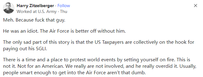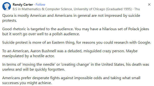 来源:https://www.quora.com/Why-are-so-few-people-talking-about-the-self-immolation-of-U-S-airman-Aaron-Bushnell-in-protest-of-Israels-atrocities-committed-against-Palestinian-civilians
