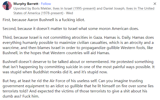 Quora:为什么很少有人谈论美国飞行员亚伦-布什内尔(Aaron Bushnell)为抗议以色列对巴勒斯坦平民的暴行而自焚的事件(2)?本文译自Quora,原标题:Why are so few people talking about the self-immolation of U.S. airman Aaron Bushnell in protest of Israel's atrocities committed against Palestinian civilians?第二,因为对以色列来说,某个白痴美国人做什么并不重要。