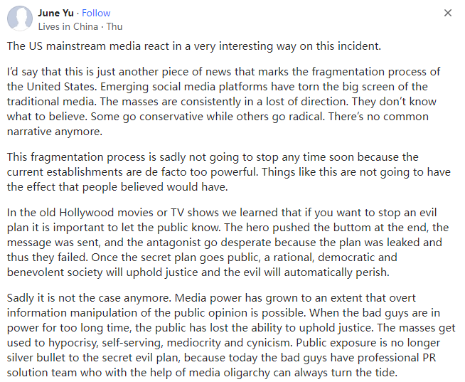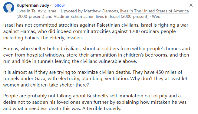 自焚对任何一方都毫无益处,而且任何一方都不会鸟他。这完全是一种浪费。人们会发现佛教僧侣在越南战争期间也做过同样的事情,但除了在可怕的痛苦中结束生命外,什么也没有改变。我记得我听说过这件事,这太偶然了,除了以色列和巴勒斯坦的政治问题之外,活活烧死自己并没有任何意义。很显然这家伙还与许多激进组织有联系,而且他已经走火入魔,根本无法让人相信他不会这么做。比起巴勒斯坦,我更支持以色列。我只是为巴勒斯坦人民感到难过,因为他们不得不忍受哈马斯虚伪而危险的领导人。不过,不管你是支持以色列还是巴勒斯坦,我都认为这家伙应该被视为一个疯狂的白痴,他被灌输了与他毫无关系的东西,而这些东西又是如此的无可救药,可惜的是在他自杀前没能联系到他。我说没能联系到他是个遗憾,是因为无论他做了多么愚蠢的事,他仍然是个有大好人生的年轻人,只是遗憾的是他在被那些团体灌输了大量思想后浪费了大好人生。根据我读到的资料,他似乎很受同龄人喜欢,工作能力也很强。Lives in Tel Aviv, Israel以色列没有对巴勒斯坦平民犯下暴行。以色列正在与哈马斯作战,而哈马斯确实对包括婴儿、老人和残疾人在内的1200名普通人犯下了暴行。哈马斯躲在平民背后,从居民家中,甚至从医院的窗户向士兵射击,他们把弹药存放在儿童的卧室里,然后跑到地道里躲藏起来,让平民在地道里受伤害。这几乎就像他们在试图最大限度地增加平民死亡人数一样。他们在加沙地下有450英里长的地道,那里有电、有管道、有通风设备,为什么他们不至少让妇女和儿童在那里避难呢?人们之所以不谈论布什内尔的自焚行为,可能是出于怜悯,不想让他的亲人因为解释他是多么的错误和这是多么不必要的死亡而更加伤心。这是一场可怕的悲剧。战争总是一种暴行,成千上万巴勒斯坦人的死亡是一场悲剧。然而,每一个人的死都应归咎于哈马斯。如果你决定与更强大的对手开战,那么你就不能不预料到会遭受巨大的反噬。屠杀儿童无论如何都是一种暴行,以色列每天都在加沙犯下暴行。你可能认为它们是正当的,但我个人不这么认为,它们仍然是暴行。儿童应该始终受到保护,而不是被用作人盾,因为以色列士兵会尽最大努力避免攻击/杀害儿童,你知道这是事实!事实。如果以色列想避免儿童死亡,他们就不会再轰炸儿童了。以色列想杀害儿童,如果他们不想,他们就不会这样做,但他们就是这样做了。你需要证明哈马斯把这3万名巴勒斯坦死者中的每一个人都当作了人盾。“人盾”的说法被以色列过度使用,国际特赦组织在2009年和2014年曾两次予以驳斥。从平民区发射火箭本身并不构成“人盾”。如果哈马斯想减少儿童伤亡,他们就会归还人质并投降。很简单。以色列在2001年至2022年间杀害了3200多名巴勒斯坦平民,在过去的4个月里杀害了11500多名加沙儿童,未经审判就对巴勒斯坦人实施监禁、野蛮殴打、强奸和性侵犯,这些都记录在美国国务院每年对该国进行的无数次人权评估中;此外,以色列还蓄意取消巴勒斯坦人的捕鱼权,实施饥饿政策并多次掠夺他们的土地,侵占已被以色列贫民窟化几十年的人民,但这些都从未登上头条新闻。2003年,以色列国防军蓄意用推土机碾死了年轻的美国和平活动家蕾切尔-柯利,而美国几乎只字不提。那么,为什么美国对其他以体面和做人的名义做出的牺牲却反应平淡甚至毫无反应呢?我想说这只是标志着美国分裂进程的又一则新闻。新兴的社交媒体平台撕裂了传统媒体的大屏幕,大众始终处于迷茫之中,他们不知道该相信什么。有人保守,有人激进,没有共同的叙事方式了。可悲的是这种分裂过程不会很快停止,因为当前的机构事实上太强大了,像这样的事情不会产生人们所认为的效果。在以前的好莱坞电影或电视剧中,我们学到了如果你想阻止一个邪恶的计划,让公众知道是很重要的。英雄在最后按下了按钮,信息传递出去了,而对手却因为计划泄露而绝望,从而失败了。一旦秘密计划公之于众,一个理性、民主和仁慈的社会就会维护正义,邪恶就会自动消亡。遗憾的是现在情况并非如此,因为媒体的力量已经发展到了可以公开操纵舆论信息的程度。坏人当权时间一长,公众就失去了维护正义的能力,群众习惯了虚伪、自私、平庸和愤世嫉俗。公众的曝光不再是秘密邪恶计划的银弹,因为如今的坏人拥有专业的公关解决团队,在媒体寡头的帮助下,他们总能力挽狂澜。但我相信布什内尔事件仍然比某些人想象的要强大,两党叙事无法承受这一点,因此即使在主流网络论坛上也有明显的“不看效应”(visible don’t-look-up)。这很可能是共同叙事最终瓦解的标志,从而也是主导意识形态瓦解的标志。未来将没有共同的叙事,人们不得不各自选择自己的描述和信仰,从而在社会交往中更加对立和两极分化。
