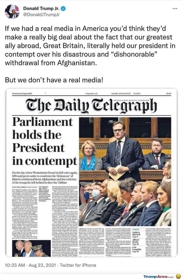 因为他虚弱(weak)、衰弱(feeble)、衰老(senile)、没有做出什么成就,且作为总统有许多被放大的失败的记录。本周末,当美国人在阿富汗逃命,南部边境面临巨大压力时,这个傻瓜又一次出现在了DE(译注:不知道是哪里,拜登当时在戴维营度假,但戴维营是Camp David)。世界各国领|导人都看到了他的无能决定,尤其是他处理阿富汗撤军的愚蠢方式。他同意了俄罗斯与德国的输油管道,但没有得到任何回报。他警告普京不要对我们国家进行网络攻击,甚至给了普京一份名单,但对美国的网络攻击仍在继续,没有任何后果。中国在人|权问题上训斥了我们的国务卿,而布林肯坐在那里接受了。拜登解除了对伊朗的制裁,解冻了伊朗用于资助恐怖主义和发展核武器的资金。他不支持为自由而游行的古巴人。朝鲜再次发射导弹,但他什么也没做。正如盖茨(Gates)所说,“拜登在每一个重大问题上都站在了错误的一边”。奥巴马说“不要低估乔把事情搞乱的能力”。他们都说的很对。