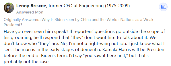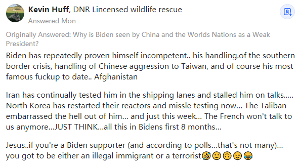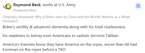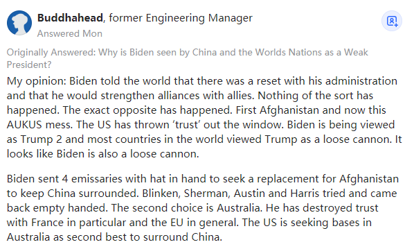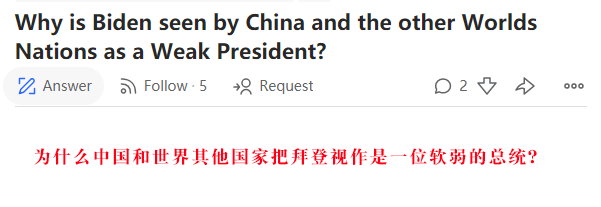 网文来自网友原文翻译投稿,所有言论皆不代表本站立场 | 本文文字/图片来自网络,侵删 | 点击页眉也可刷新 | 本文内容仅供娱乐,不作任何严肃之用途拜登出了什么问题,为什么中国和世界其他国家都觉得拜登“软弱”?本文译自Quora,原标题:Why is Biden seen by China and the other Worlds Nations as a Weak President?