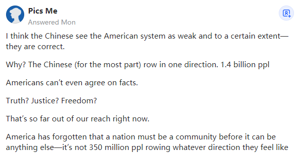 我想中国人会认为美国的制度是软弱的,在某种程度上他们是正确的。为什么?因为14亿中国人(大部分)都在朝着一个方向在前进。美国已经忘记了,一个国家在成为任何事情之前必须先成为一个集体,而不是3.5亿人按照各自喜欢的方向胡乱划船。