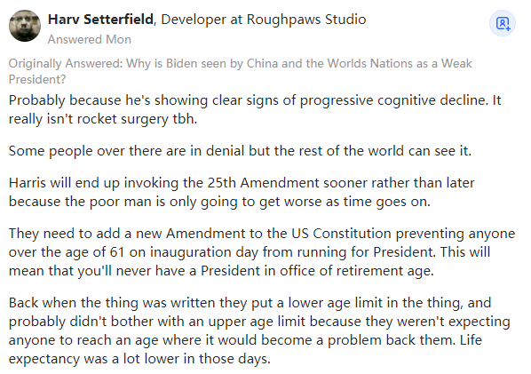 可能是因为他表现出了明显的渐进性的认知下降的迹象,说实话,要看出这一点真的不需要什么高难度的技术。白宫的一些人否认了这一点,但世界其他地方人又不是傻子。哈里斯迟早会援引宪法第25条修正案,因为随着时间的推移,这个可怜的人的情况只会变得更糟。美国人需要在宪法中增加一项新的修正案,防止在就职日超过61岁的人竞选总统,这将意味着你永远不会有一个达到退休年龄的总统。当时在编写美国宪法的时候,他们设定了一个较低的年龄限制,而且可能没有设定年龄上限,因为他们不希望年龄成为任何人的困扰。但在那个时代,人们的预期寿命比现在要低得多。