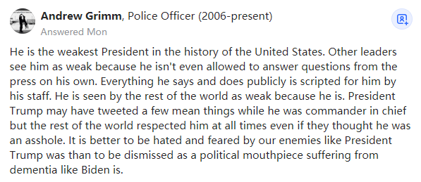 他是美国历史上最软弱的总统。其他国家的领|导人认为他软弱,是因为他甚至不被允许自己回答媒体的提问。他公开说的每一句话和做的每一件事都是由他的幕僚为他编写的。他被世界其他地方的人认为很软弱,因为他本来就是。特朗普总统在担任美国总统期间可能在推特上发表了一些刻薄的言论,但世界其他国家一直尊重他,即使他们认为他是个混蛋。像特朗普总统那样被我们的敌人憎恨和恐惧,总比像拜登那样被视为一个患有老年痴呆症的政治代言人要好。