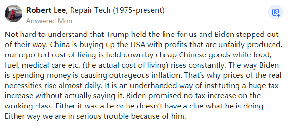 这不难理解,因为特朗普为我们守住了底线,而拜登则为中国让开了路。中国正在用不公平贸易产生的利润收购美国。我们被告知我们的生活成本被廉价的中国商品压低了,但食品、燃料、医疗等(实际生活成本)在不断上升。拜登花钱的方式导致了令人发指的通货膨胀,这就是为什么真正的必需品的价格几乎每天都在上涨,这是一种不露声色地大幅增加税收的手段。拜登承诺不对工人阶级增税,这要么是谎言,要么就是他根本不知道自己在做什么。不管怎样,我们都因为他陷入了严重的麻烦。
