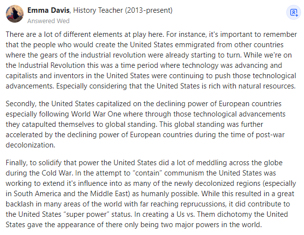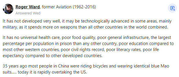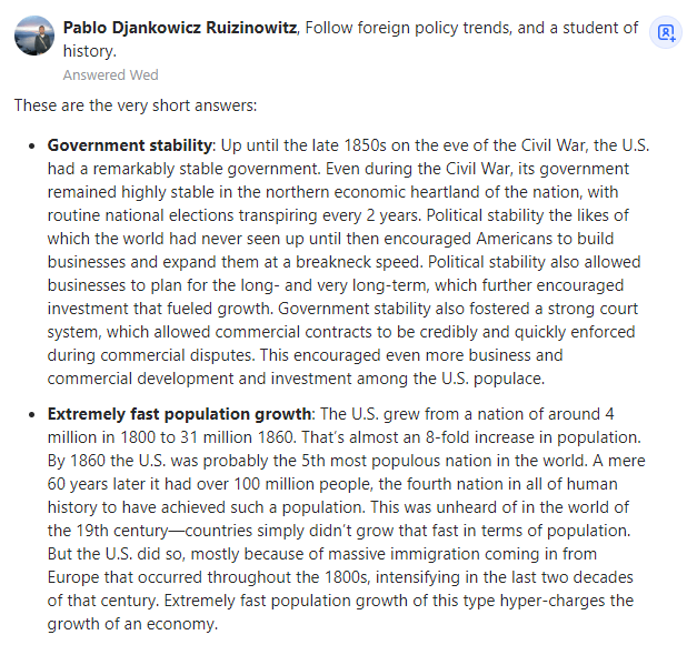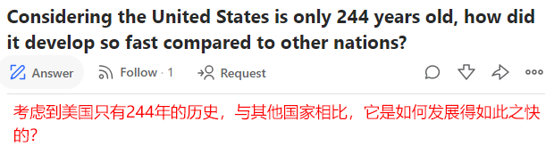 美国崛起的秘密:为什么只有244年历史的美国这么快就登上了世界之巅? 本文译自Quora,原标题:Considering the United States is only 244 years old, how did it develop so fast compared to other nations?Pablo Djankowicz RuizinowitzFollow foreign policy trends, and a student of history.政府稳定:直到19世纪50年代末内战前夕,美国政府一直非常稳定。即使在内战期间,该国政府在该国北部经济中心地带仍保持高度稳定,每两年举行一次例行的全国选举。政治稳定——直到那时,全世界还从未见过这样的稳定——鼓励美国人以惊人的速度建立企业并加以扩张。政治稳定也允许企业做出长期的规划,这进一步鼓励了推动经济增长的投资。政府的稳定也促进了强有力的司法系统,使商业合同在商业纠纷期间能够得到可信和迅速的执行,这鼓励了更多的商业机会和商业发展以及美国民众的投资。人口增长极为迅速:从1800年到1860年,美国的人口从400万人增长到了3100万,几乎增长了8倍。到1860年,美国可能是世界第五人口大国,而仅仅60年后,它就拥有了1亿多人口,它是人类历史上第四个拥有如此规模人口的国家。这在19世纪的世界上是闻所未闻的,其他国家的人口增长并没有那么快。但美国之所以如此,主要是因为整个19世纪都有大量来自欧洲的移民涌入,在那个世纪的最后20年里,移民人数不断增加。这种类型的人口增长速度,给经济增长带来了巨大的推动力。巨大的自然资源禀赋:在国家政府高度稳定、人口增长迅速的同时,美国也拥有丰富的自然资源,尤其是土地和矿产资源。美国东部三分之一地区的气候和土壤剖面非常适合建立与欧洲相似的农场,这鼓励了来自欧洲大陆的大量移民。与此同时,美国巨大的矿产资源——尤其是煤炭、铁和其他金属资源——能够维持工业化,从而进一步推动经济高速增长(尤其是在内战之后)。工业化:在西方工业化刚刚起步的时候,美国幸运地把所有这些因素聚集在了一起。从英国开始,工业化加速了经济发展,这鼓励了更多的来自欧洲的移民,进一步增加了人口,从而促进了经济发展并加剧了工业化。这是一个加强再加强工业化的良性循环,一直到20世纪70年代,美国靠着这一良性循环实现了几乎不间断的、广泛的、难以置信的繁荣。通过这一良性循环,美国在几乎所有方面都跃升到了世界领先的地位,但一旦这种循环从上世纪70年代开始崩溃,美国就有点迷失了方向。如果它曾经是世界领先者的话,但在过去的40年里,美国在许多指标上都越来越落后于更繁荣的发达国家。从全球标准来看,中国仍然只能是一个暴富的社会,但美国已经不在顶端了。History Teacher (2013-present)这里有很多不同的元素在起作用。例如,重要的是要记住,创造美国的人是从其他国家移民过来的,那里的工业革命已经开始启动。当我们正在进行工业革命的时候,这是一个技术进步的时期,美国的资本家和发明家继续推动着这些技术进步,尤其是还要考虑到美国拥有丰富的自然资源。第二,美国利用了欧洲国家实力的下降(尤其是在第一次世界大战之后),通过这些技术进步,美国迅速提升了自己的全球地位。战后非殖民化时期欧洲国家实力的下降进一步加速了这种全球地位。最后,为了巩固这种力量,美国在冷战期间在全球进行了大量的干预。为了“遏制”GC主义,美国努力将其影响扩大到尽可能多的新的非殖民化地区(尤其是在南美洲和中东)。虽然这在世界许多地区引起了巨大的反弹并引发了深远的争论,但它确实为美国的“超级大国”地位作出了贡献。在创造一个美国VS他们的二分法的同时,美国给人的印象是世界上只有两个主要的大国。former Aviation (1962-2016)美国的发展并不是很好,虽然在某些领域(主要是军事领域)它的技术可能是先进的,因为它在武器上的花费超过了世界上所有其他国家的总和。但美国没有普遍的医疗保健,食品质量很差,基础设施很差,监狱里的囚犯按人口比例比任何其他国家都高,教育水平比大多数其他西方国家都差,人|权|记录不好,识字率低,预期寿命比其他发达国家都低。而35年前,大多数中国人都骑自行车,穿着一模一样的蓝色毛装…但如今,它正在迅速超越美国。Ph.d from State University of New York at Oneonta (2000)美国的历史只有244年吗?根据宪法,美国是现存最古老的国家之一,只有一两块小领地拥有比美国更古老的宪法文件。