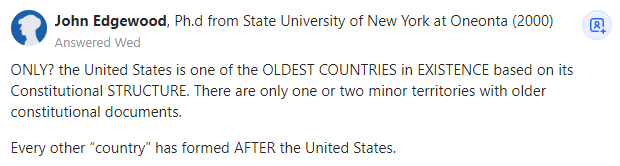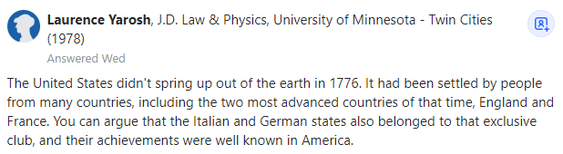 J.D. Law & Physics, University of Minnesota - Twin Cities (1978)美国并不是在1776年突然从地球上崛起的,它是由许多国家的人定居下来(包括当时最先进的两个国家,英国和法国)建立的。你可以说意大利和德国也属于这家俱乐部,因为它们的成就在美国是众所周知的。Gregory Norton:美国文化是英国文化的一个分支,已有1000多年的历史。美国只是稍微有点区别,因为它融入了许多其他的文化。Zhou YU:美国是历史最悠久的连续政权之一。随着时间的推移,大多数国家都经历了战争和革命。感谢诸位亲的相伴与支持,由于个别文章的用词和地图使用不规范,全部文章会在审核整理之后陆续上架,新翻译的文章会特别标注,未做标注的为发布过的文章。为避免误点收费文并祝大家新年快乐,所有1月17日之前注册的用户均已获赠1000花瓣,敬请查收。每日登陆送5花瓣 | 联系方式:QQ-1399710240 ,有任何问题请发邮件或者加QQ。因网站有改动,如出现版面问题清理一下cookies即可。