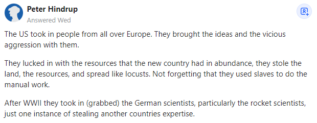 美国接收了来自欧洲各地的人,他们带来了想法和恶毒的侵略活动。他们幸运地利用了这个新国家丰富的资源,偷走了土著的土地并像蝗虫一样蔓延开来。别忘了他们还利用奴隶做体力活。第二次世界大战后,他们抓了很多德国科学家,尤其是火箭科学家,这仅仅是他们窃取别国专家和知识的一个例子。明尼苏达大学双城分校法学与物理学博士(1978年)