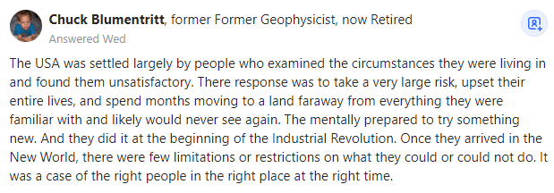 former Former Geophysicist, now Retired美国主要是由那些审视他们所处环境并发现它们不尽如人意的人建立的。他们一生都不追求安稳,他们冒了很大的风险,花几个月的时间才搬到一个远离他们熟悉的、可能再也看不到的地方。他们是准备尝试新事物的人,他们在工业革命之初就这样做了。一旦他们来到新世界,他们能做或不能做的事情就几乎不存在限制。这是一个正确的人在正确的时间和正确的地点出现的一个例子。
